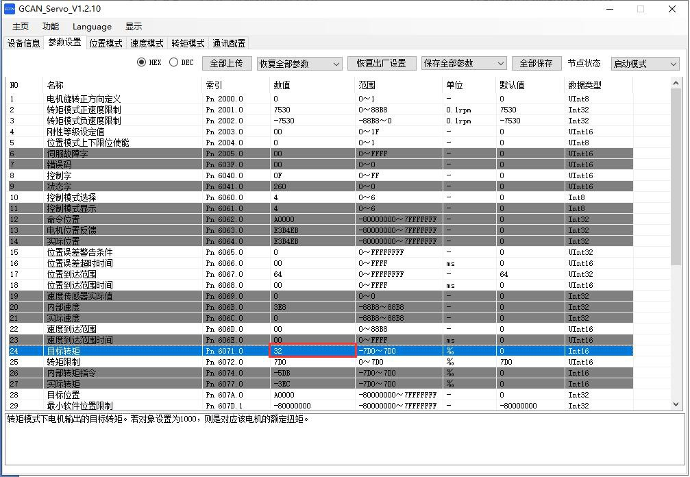 4、設(shè)置目標(biāo)轉(zhuǎn)矩:索引Pn 6071.0輸入32,單位‰Tn。即以5%的轉(zhuǎn)矩運(yùn)行。