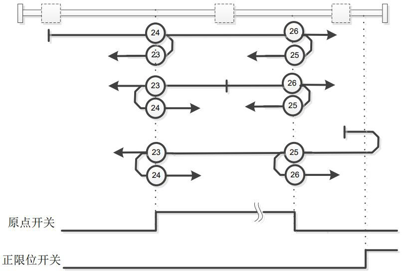 方法23~26:檢測原點(diǎn)開關(guān)、正限位開關(guān)變化的位置方法23:
