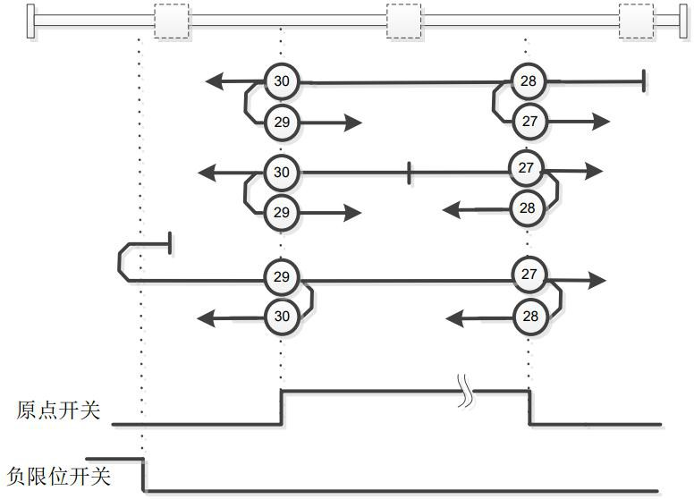 B:啟動(dòng)時(shí)原點(diǎn)開關(guān)信號(hào)無效時(shí):驅(qū)動(dòng)器首先以0x6099.2的低速向負(fù)方向移動(dòng),遇到負(fù)限位開關(guān),驅(qū)動(dòng)器以0x6099.1的高速向正方向移動(dòng),遇到原點(diǎn)開關(guān)信號(hào)變?yōu)橛行r(shí)(沿變化),0x6099.2的低速向負(fù)方向移動(dòng),遇到原點(diǎn)開關(guān)信號(hào)變?yōu)闊o效時(shí)(沿變化)停止;
