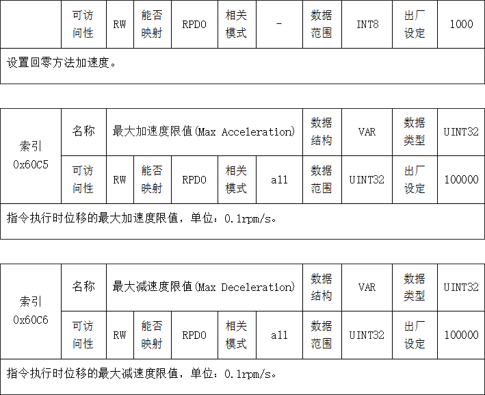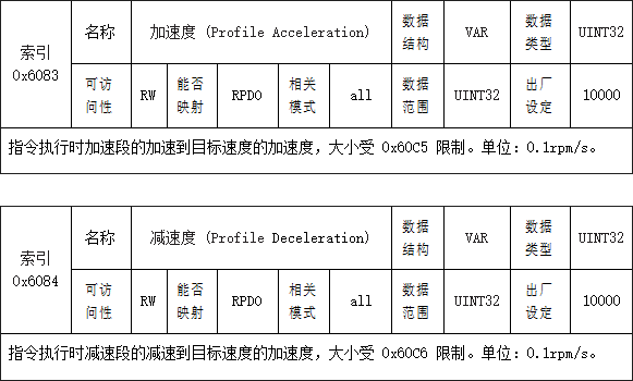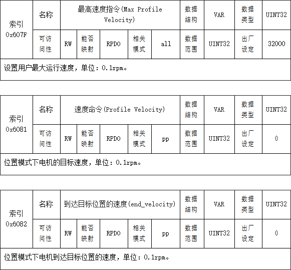 索引0x6099.1輸入3000,單位0.1rpm,即第一段高速轉(zhuǎn)速為3000*0.1rpm。索引0x6099.2輸入300,單位0.1rpm,即第二段低速轉(zhuǎn)速為300*0.1rpm。