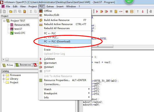 4、在下拉菜單中點擊PC->PLC(Download)下載程序。