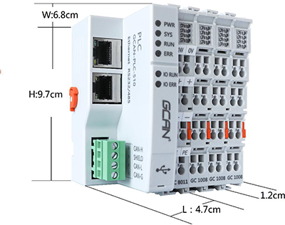 完整的GCAN-PLC-510控制器外觀如下圖所示。GCAN-PLC-510等主控模塊包含3個通信接口、1個控制器編程接口、1組控制器電源接口、2組I/O電源接口、2組屏蔽線接口。其中,通信接口包括1個以太網(wǎng)接口、1個CAN總線接口和1個RS232/RS485接口;控制器編程接口使用以太網(wǎng)接口。