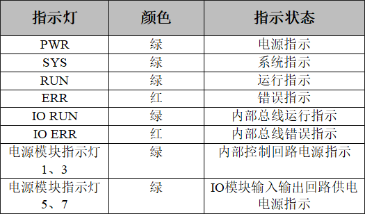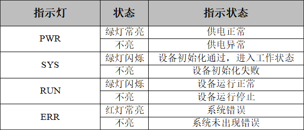 GCAN-PLC-510的正面突出區(qū)域包含6個圓形狀態(tài)指示燈。指示燈的具體指示功能見下表。指示燈處于不同狀態(tài)下時,GCAN-PLC-510的狀態(tài)如下表所示。