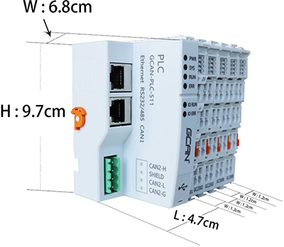 - GCAN-PLC-511是一款集成有總線控制功能的可編程邏輯控制器(PLC)。其不僅具有外觀簡約、高性價比的特點,還可以方便的連接入CAN總線系統(tǒng)及Modbus系統(tǒng)等,并可通過模塊插片式進行擴展。它由一個可編程的主控模塊(GCAN-PLC-511等)、若干GC系列IO模塊(GC-1008、GC-3804等)以及一個終端電阻模塊(GC-0001)組成。GCAN-PLC-511等主控模塊可連接所有的GC系列IO模塊,用戶可根據(jù)現(xiàn)場實際需求自行選擇擴展IO模塊,在電源供應(yīng)充足情況下,IO模塊數(shù)量最多可擴展32個,主控模塊可根據(jù)插入IO模塊的前后位置自動分配地址,實現(xiàn)自動組態(tài),用戶無需在PC上創(chuàng)建組態(tài)界面及設(shè)置參數(shù)。