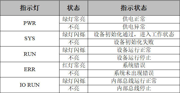 GCAN-PLC的正面突出區(qū)域包含6個圓形狀態(tài)指示燈。指示燈的具體指示功能見下表。指示燈處于不同狀態(tài)下時,GCAN-PLC的狀態(tài)如下表所示。