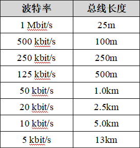 請注意:CAN-bus電纜可以使用普通雙絞線、屏蔽雙絞線。理論最大通信距離主要取決于總線波特率,最大總線長度和波特率關(guān)系詳見下表。若通訊距離超過1km,應(yīng)保證線的截面積大于Φ1.0mm2,具體規(guī)格應(yīng)根據(jù)距離而定,常規(guī)是隨距離的加長而適當加大。
