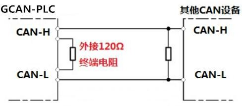 請注意:GCAN-PLC的CAN總線內(nèi)部未集成120Ω終端電阻。如果節(jié)點數(shù)目大于2,中間節(jié)點不需要安裝120Ω的終端電阻。需要使用時,將電阻兩端分別接入CAN_H、CAN_L即可,如圖所示。