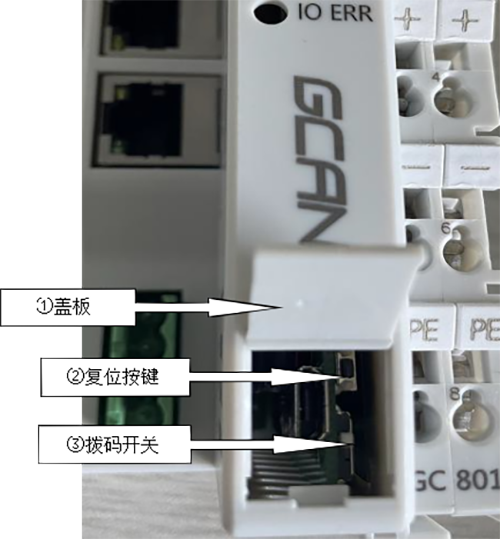 GCAN-PLC-511提供1個程序運行開關(guān)和1個復位按鈕。打開蓋板后實物圖如圖所示。