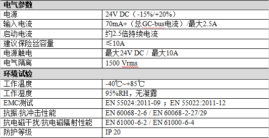 (1)2路CAN總線接口,1路以太網(wǎng)接口,1路RS232接口、1路RS485接口;(2)編程軟件:OpenPCS/CodeSys(編程語言符合IEC61131-3標準);(3)支持CANopen協(xié)議主/從站功能;(4)支持ModbusRTU/TCP主/從站功能;(5)在電源供應(yīng)充足情況下可擴展IO模塊數(shù)量最多為32個(最多32x8個DI/DO點);其中當擴展模塊數(shù)量超過16片時,需額外增加一片上述的IO供電擴展模塊GC 8012以保證電源供應(yīng)充足;(6)默認發(fā)送PDO(CANopen)4個,接收PDO(CANopen)4個;(7)組態(tài)方式為自動組態(tài)形式;(8)電源采用24VDC(18~30V);(9)輸入電流最大為400mA(總GC-bus電流);(10)啟動電流:約為2.5倍的持續(xù)電流;(11)電源觸點:最大24VDC;(12)電氣隔離為1500Vrms;(13)工作溫度范圍:-40℃~+85℃;(14)防護等級:IP20;
