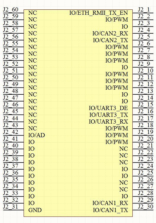 GCAN-PLCcore-M7核心板采用“3710F端子”型號連接器與底板連接,如用戶想自己開發(fā)底板,則底板參考原理圖及引腳定義如下圖所示,具體連接器原理圖及封裝可收到貨后向技術支持工程師索要。