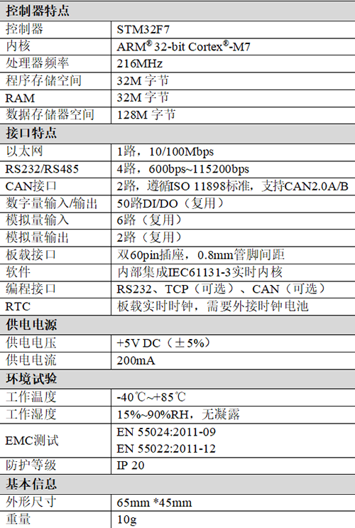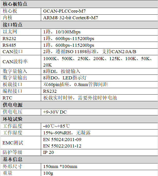 PLCCore-EDV-M7開發(fā)套件(GCAN-PLCCore-M7核心板配套底板)技術參數如下所示: