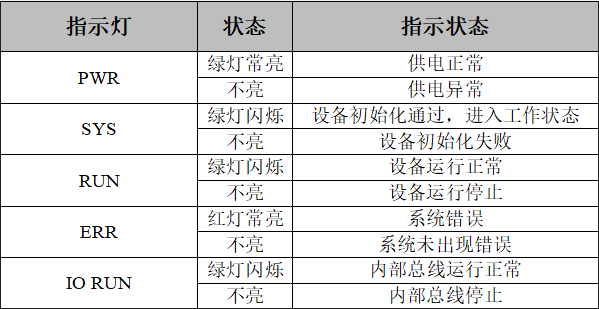 GCAN-PLC-400的正面突出區(qū)域包含6個(gè)圓形狀態(tài)指示燈。指示燈的具體指示功能見(jiàn)下表。指示燈處于不同狀態(tài)下時(shí),GCAN-PLC-400的狀態(tài)如下表所示。