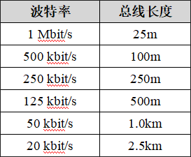 請(qǐng)注意:CAN-bus電纜可以使用普通雙絞線、屏蔽雙絞線。理論最大通信距離主要取決于總線波特率,最大總線長(zhǎng)度和波特率關(guān)系詳見(jiàn)下表。若通訊距離超過(guò)1km,應(yīng)保證線的截面積大于Φ1.0mm2,具體規(guī)格應(yīng)根據(jù)距離而定,常規(guī)是隨距離的加長(zhǎng)而適當(dāng)加大。