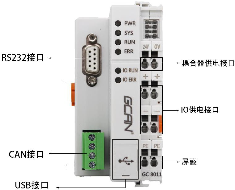 GCAN-IO-8000外觀如圖所示。GCAN-IO-8000 CANopen總線耦合器包含2個(gè)通信接口,一個(gè)USB接口,1組耦合器電源接口,2組I/O電源接口,2組屏蔽線接口。其中,通信接口包括1個(gè)CAN總線接口和1個(gè)RS232接口。USB接口可用來升級(jí)固件。