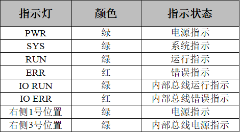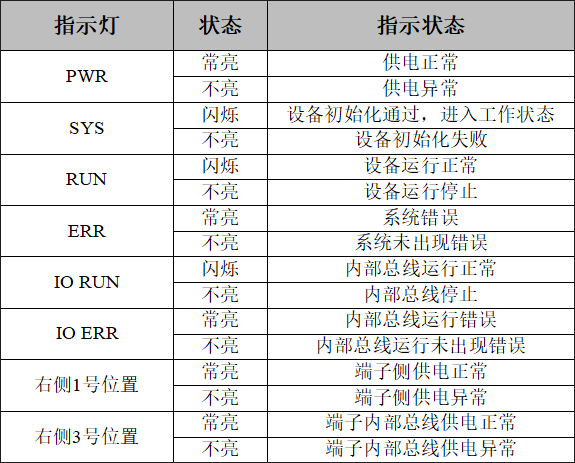 GCAN-IO-8000 CANopen總線耦合器具有兩組狀態(tài)指示燈。左側(cè)區(qū)域包含6個(gè)圓形狀態(tài)指示燈,右側(cè)區(qū)域包含2個(gè)小型電源指示燈。指示燈的具體指示功能見下表。指示燈處于不同狀態(tài)下時(shí),GCAN-IO-8000模塊狀態(tài)如下表所示。