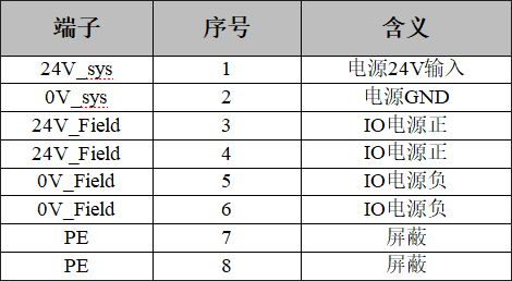 GCAN-IO-8000 CANopen總線耦合器的電源接線端子排如圖所示。GCAN-IO-8000 CANopen總線耦合器包含8個(gè)端子,各個(gè)端子對(duì)應(yīng)的序號(hào)及其含義如下表所示。請(qǐng)注意,3號(hào)端子與4號(hào)端子之間、5號(hào)端子與6號(hào)端子之間、7號(hào)端子與8號(hào)端子之間,在模塊的內(nèi)部是相連的。