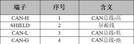 GCAN-IO-8000 CANopen總線耦合器的CAN總線端子排如下圖所示。GCAN-IO-8000的CAN總線端子排包含4個(gè)端子,各個(gè)端子對(duì)應(yīng)的序號(hào)及其含義如下表所示。