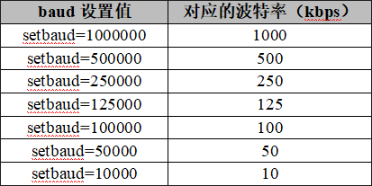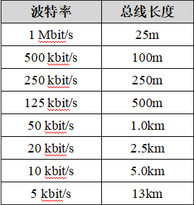 請(qǐng)注意:CAN-bus電纜可以使用普通雙絞線、屏蔽雙絞線。理論最大通信距離主要取決于總線波特率,最大總線長(zhǎng)度和波特率關(guān)系詳見下表。若通訊距離超過1km,應(yīng)保證線的截面積大于Φ1.0mm2,具體規(guī)格應(yīng)根據(jù)距離而定,常規(guī)是隨距離的加長(zhǎng)而適當(dāng)加大。