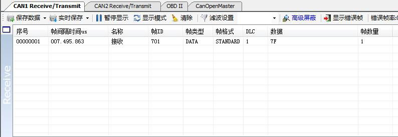 例如:通過撥碼開關(guān)設(shè)置GCAN-IO-8000的Node ID為1,則USBCAN-II Pro作為主站設(shè)備可接收到一條啟動(dòng)命令,幀ID為0x701,幀數(shù)據(jù)為0x7F。如下圖所示,使用ECANTools軟件可以收到這條數(shù)據(jù)。