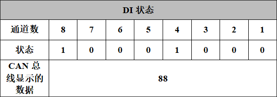 例如,GCAN-IO-8000模塊節(jié)點(diǎn)號(hào)設(shè)為1。通道8和通道4狀態(tài)為1,其他狀態(tài)均為0,則CAN總線一端顯示的DI狀態(tài)數(shù)據(jù)為88。則發(fā)出的幀ID為0x181,數(shù)據(jù)長(zhǎng)度(DLC)為8,幀數(shù)據(jù)為0x88,0x00,0x00,0x00,0x00,0x00,0x00,0x00。請(qǐng)注意,僅插入一個(gè)GCAN-1008模塊時(shí),幀數(shù)據(jù)中只有第一個(gè)字節(jié)是有效的。下表列舉了兩種常見的DI狀態(tài)及其對(duì)應(yīng)的狀態(tài)數(shù)據(jù)。