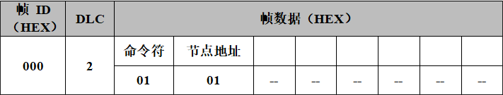 GCAN-IO-8000模塊接收由主站發(fā)出的操作指令,幀ID為0x000,DLC為2,幀數(shù)據(jù)第一個(gè)字節(jié)為命令符,第二個(gè)字節(jié)為節(jié)點(diǎn)號(hào)(00則為全部節(jié)點(diǎn))。