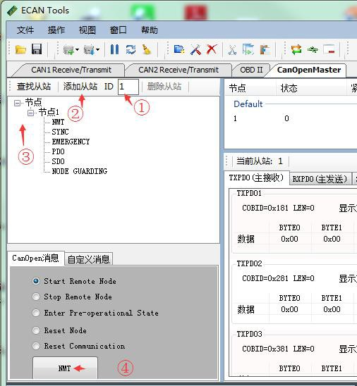 例如:GCAN-IO-8000的Node ID為1,命令GCAN-IO-8000為進(jìn)入操作狀態(tài)(01),則NMT命令幀ID為0x000,幀數(shù)據(jù)為0x01,0x01。該命令也可由ECANTools軟件的CANopenMaster插件發(fā)出。