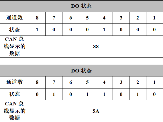 例如,GCAN-IO-8000模塊節(jié)點(diǎn)號(hào)設(shè)為1。需設(shè)置通道8和通道4狀態(tài)為1,設(shè)置其他狀態(tài)均為0,則需要發(fā)送的CAN總線DO狀態(tài)數(shù)據(jù)為88。需要發(fā)送給GCAN-IO-8000的幀ID為0x201,數(shù)據(jù)長(zhǎng)度(DLC)為8,幀數(shù)據(jù)為0x88,0x00,0x00,0x00,0x00,0x00,0x00,0x00。請(qǐng)注意,幀數(shù)據(jù)中只有第一個(gè)字節(jié)是有效的。下表列舉了兩種常見的DO狀態(tài)及其對(duì)應(yīng)的狀態(tài)數(shù)據(jù)。