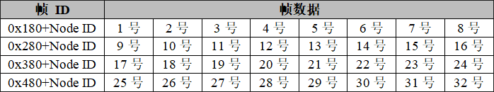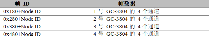 若GCAN-IO-8000同時(shí)搭載多組GC-3804模塊,那么我們以它們距離GCAN-IO-8000的遠(yuǎn)近,從近到遠(yuǎn)進(jìn)行編號(hào),離得最近的為1號(hào)。GCAN-IO-8000耦合器發(fā)出的TPDO數(shù)據(jù)將按照下表進(jìn)行發(fā)送。例如,當(dāng)GCAN-IO-8000節(jié)點(diǎn)號(hào)為3且同時(shí)搭載4個(gè)GC-3804模塊時(shí),您將收到幀ID為0x183等四組數(shù)據(jù)。其中,幀ID為0x183的八個(gè)數(shù)據(jù)字節(jié)依次對(duì)應(yīng)1號(hào)GC-3804模塊的4個(gè)通道;幀ID為0x283的八個(gè)數(shù)據(jù)字節(jié)依次對(duì)應(yīng)2號(hào)GC-3804模塊的4個(gè)通道。
