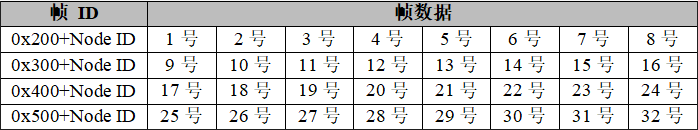 若GCAN-IO-8000同時(shí)搭載多組GC-1008模塊,那么我們以它們距離GCAN-IO-8000的遠(yuǎn)近,從近到遠(yuǎn)進(jìn)行編號(hào),離得最近的為1號(hào)。GCAN-IO-8000耦合器發(fā)出的TPDO數(shù)據(jù)將按照下表進(jìn)行發(fā)送。例如,當(dāng)GCAN-IO-8000節(jié)點(diǎn)號(hào)為3且同時(shí)搭載9個(gè)GC-1008模塊時(shí),您將收到幀ID為0x183和0x283兩組數(shù)據(jù)。其中,幀ID為0x183的八個(gè)數(shù)據(jù)字節(jié)依次對(duì)應(yīng)1-8號(hào)GC-1008模塊;幀ID為0x283的一個(gè)數(shù)據(jù)字節(jié)對(duì)應(yīng)9號(hào)GC-1008模塊。