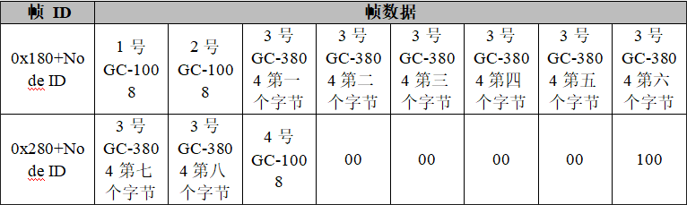 若GCAN-IO-8000同時(shí)搭載GC-1008模塊與GC-3804模塊,那么我們以它們距離GCAN-IO-8000的遠(yuǎn)近,從近到遠(yuǎn)進(jìn)行編號(hào),離得最近的為1號(hào)。GCAN-IO-8000耦合器發(fā)出的TPDO數(shù)據(jù)將按照下表進(jìn)行發(fā)送。例如,當(dāng)GCAN-IO-8000模塊節(jié)點(diǎn)號(hào)為3且同時(shí)搭載3個(gè)GC-1008模塊和1個(gè)GC-3804模塊時(shí),您將收到幀ID為0x183和0x283兩組數(shù)據(jù)。數(shù)據(jù)對(duì)應(yīng)關(guān)系如下表所示。