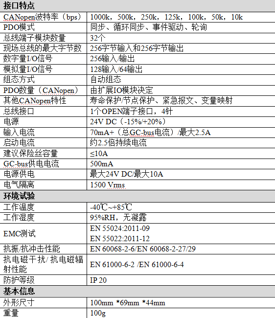 (1)CANopen波特率支持1000k、500k、250k、125k、100k、50k、10k;(2)PDO模式支持同步、循環(huán)同步、事件驅(qū)動(dòng)、輪詢;(3)總線端子模塊數(shù)量最多為32個(gè);(4)發(fā)送PDO(CANopen)由擴(kuò)展的輸入模塊數(shù)量決定,接收PDO(CANopen)由擴(kuò)展的輸出模塊數(shù)量決定;(5)組態(tài)方式為自動(dòng)組態(tài)形式;(6)CAN總線接口為1個(gè)開放式的4針端子;(7)電源采用24V DC(-15%/+20%);(8)輸入電流為70mA+(總GC-bus電流),最大為2.5A;(9)啟動(dòng)電流:約為2.5倍的持續(xù)電流;(10)電源供電:最大24V DC/最大10A;(11)電氣隔離為1500 Vrms;(12)工作溫度范圍:-40℃~+85℃;(13)尺寸:長(zhǎng)100mm*寬69mm*高48mm。