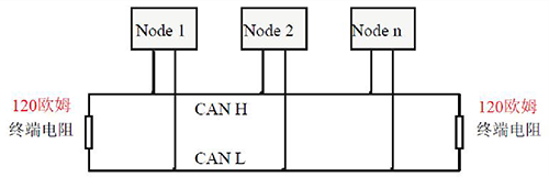 為了增強(qiáng)CAN通訊的可靠性,消除CAN總線終端信號(hào)反射干擾,CAN總線網(wǎng)絡(luò)最遠(yuǎn)的兩個(gè)端點(diǎn)通常要加入終端匹配電阻,如圖所示。終端匹配電阻的值由傳輸電纜的特性阻抗所決定。例如雙絞線的特性阻抗為120Ω,則總線上的兩個(gè)端點(diǎn)也應(yīng)集成120Ω終端電阻。如果網(wǎng)絡(luò)上其他節(jié)點(diǎn)使用不同的收發(fā)器,則終端電阻須另外計(jì)算。