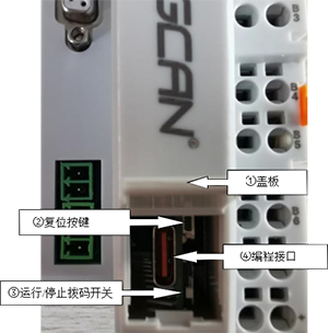 GCAN-PLC-301/302提供1個(gè)程序運(yùn)行開關(guān)、1個(gè)復(fù)位按鍵和一個(gè)編程接口。打開蓋板后實(shí)物圖如圖所示: