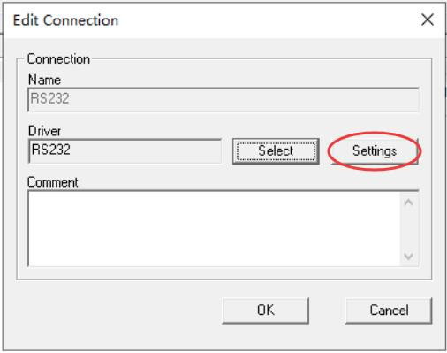 5、Driver中會(huì)顯示“RS232”字樣,點(diǎn)擊“Settings(設(shè)置)”按鈕。