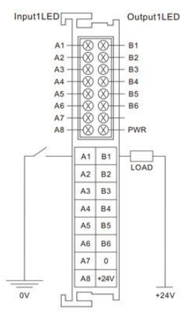 GCAN-PLC-320/321/322自帶8路輸入,6路輸出的數(shù)字量模塊。默認(rèn)發(fā)貨PNP型,需單獨(dú)外接電源使用(與GCAN-PLC-320/321/322電源隔離)。其中A1~A5為數(shù)字量輸入與高速計(jì)數(shù)輸入復(fù)用;B1~B5為數(shù)字量輸出與PWM高速脈沖輸出復(fù)用。接線時(shí)使用一字端子接頭的線纜,將端子接頭對(duì)準(zhǔn)相應(yīng)通道的圓孔插入即可;拆線時(shí),需使用一字螺絲刀,插入需拆線的通道對(duì)應(yīng)方形孔,用力向下按壓(也可輕微撬動(dòng)),此時(shí)相應(yīng)圓孔中的夾片會(huì)松動(dòng),線纜可輕松拔出。