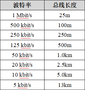 請(qǐng)注意:CAN-bus電纜可以使用普通雙絞線、屏蔽雙絞線。理論最大通信距離主要取決于總線波特率,最大總線長(zhǎng)度和波特率關(guān)系詳見(jiàn)下表。若通訊距離超過(guò)1km,應(yīng)保證線的截面積大于Φ1.0mm2,具體規(guī)格應(yīng)根據(jù)距離而定,常規(guī)是隨距離的加長(zhǎng)而適當(dāng)加大。