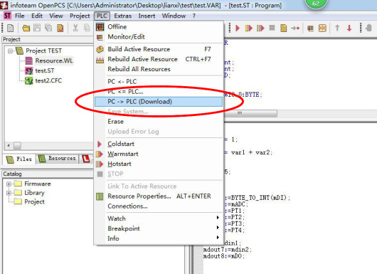 4、在下拉菜單中點(diǎn)擊PC->PLC(Download)下載程序。