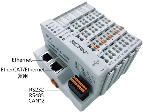 GCAN-PLC-530不僅可完成各種數(shù)字/模擬量的輸入/輸出,還集成了多種常用的工業(yè)現(xiàn)場(chǎng)總線,如:RS232/485總線、CAN總線、以太網(wǎng)總線、EtherCAT總線。