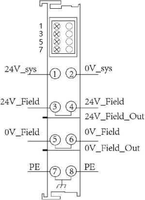 PLC主控模塊的電源接線端子排如圖2.8所示。PLC主控模塊包含8個(gè)端子,各個(gè)端子對(duì)應(yīng)的序號(hào)及其含義如表2.2所示。請(qǐng)注意,3號(hào)端子與4號(hào)端子之間、5號(hào)端子與6號(hào)端子之間、7號(hào)端子與8號(hào)端子之間,在模塊的內(nèi)部是相連的。
