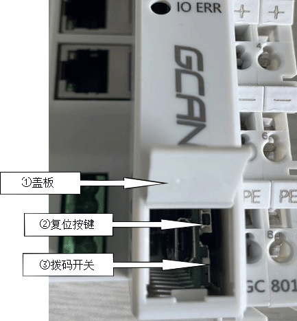 GCAN-PLC-530提供1個(gè)程序運(yùn)行開關(guān)和1個(gè)復(fù)位按鈕。打開蓋板后實(shí)物圖如圖4.1所示。