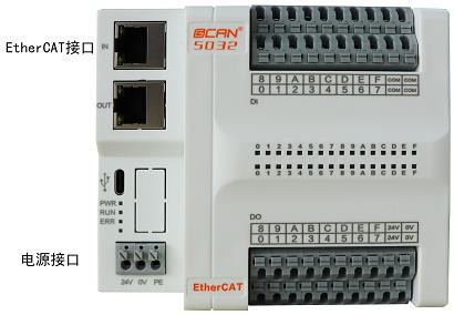 GCAN-5032模塊集成2個(gè)EtherCAT通信接口,一個(gè)USB-Type C接口,1個(gè)電源接口,2組I/O電源接口(電源內(nèi)部已短接),4個(gè)DI的COM接口。GCAN-4032模塊的EtherCAT通信接口、電源接口位置如圖所示,接口定義如表所示。