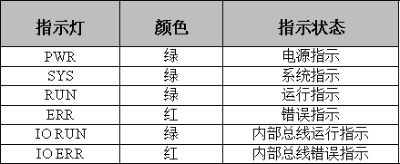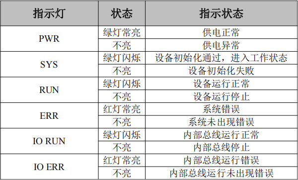GCAN-PLC-430的正面突出區(qū)域包含6個(gè)圓形狀態(tài)指示燈。指示燈的具體指示功能見下表。指示燈處于不同狀態(tài)下時(shí),GCAN-PLC-430的狀態(tài)如表所示。