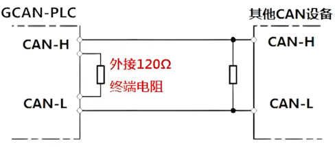 請(qǐng)注意:GCAN-PLC-430的CAN總線內(nèi)部未集成120Ω終端電阻。如果節(jié)點(diǎn)數(shù)目大于2,中間節(jié)點(diǎn)不需要安裝120Ω的終端電阻。需要使用時(shí),將電阻兩端分別接入CAN_H、CAN_L即可,如上圖所示。