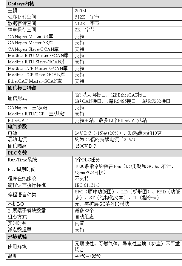 (1)1路EtherNet;1路EtherCAT;2路CAN;1路RS485;1路RS232;(2)編程軟件:OpenPCS/CodeSys(編程語言符合IEC61131-3標(biāo)準(zhǔn));(3)支持CANopen協(xié)議主/從站功能;(4)支持Modbus RTU/TCP主/從站功能;(5)支持EtherCAT主站功能;從站數(shù):最多10個(gè)EtherCAT從站;(6)組態(tài)方式為自動(dòng)組態(tài)形式;(7)電源采用24V DC;輸入電流最大為1A;(8)通信隔離為1500V DC;(9)工作溫度范圍:-40℃~+85℃;(10)防護(hù)等級(jí):IP20;(11)EMC抗干擾等級(jí):Zone B;(12)EMC抗干擾支持:供電通道、RS485通道、CAN1通道。