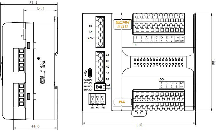 圖2.1 GCAN-PLC-200模塊外形尺寸圖