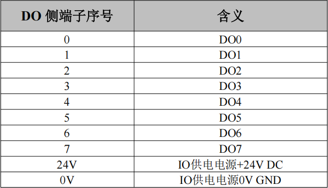 GCAN-PLC-200的主控模塊右側頂板含有上下四排端子排,下方兩排端子排的右側為DO端子排,分別為DO0~DO7共8個數(shù)字量輸出點,以及1組IO供電電源接口(IO供電電源已與系統(tǒng)電源隔離,IO模塊需供電后才能正常工作),如圖所示。各個端子對應的序號及其含義如表2.4所示。