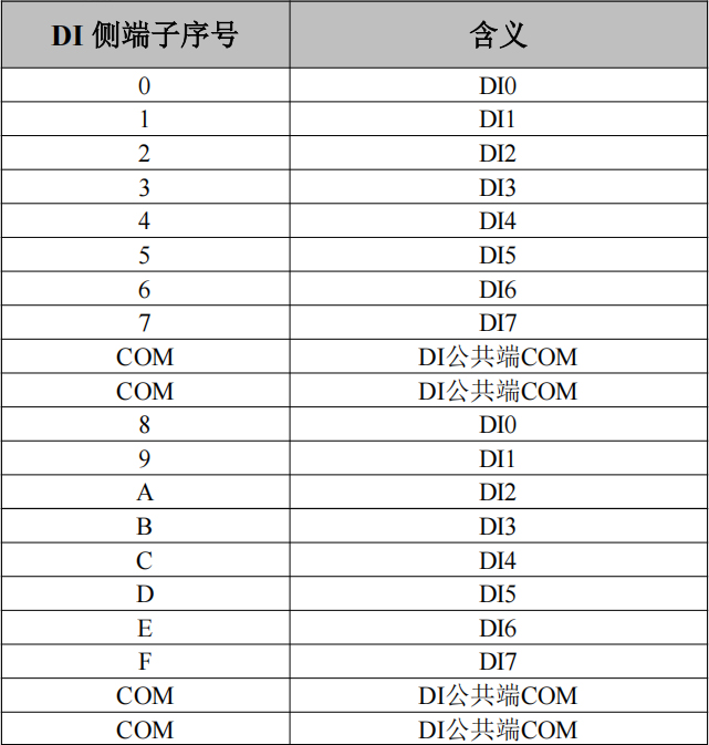 上方兩排端子為DI端子排,分別為DI0~DI7,DI8~DIF共16個數(shù)字量輸入點,以及4個DI的COM接口(4個COM口內部已短接,任意連接1個即可),如圖所示。各個端子對應的序號及其含義如表2.5所示。