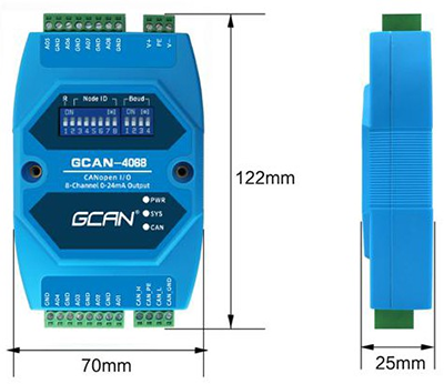 沈陽(yáng)廣成科技GCAN-4068模塊是集成1路標(biāo)準(zhǔn)CANopen接口、8路0-24mA電流輸出的工業(yè)級(jí)CANopen模擬量輸出模塊。采用GCAN-4068模塊,用戶可輸出電流信號(hào),實(shí)現(xiàn)遠(yuǎn)程設(shè)備和CANopen網(wǎng)絡(luò)之間的連接,構(gòu)成CANopen網(wǎng)絡(luò)中信號(hào)輸出的控制節(jié)點(diǎn)。GCAN-4068模塊是模擬量信號(hào)輸出的關(guān)鍵性工具,同時(shí)該模塊具有體積小巧、接線便捷等特點(diǎn)。GCAN-4068模塊的總線接口集成隔離保護(hù)模塊,使其避免由于瞬間的過(guò)壓過(guò)流而對(duì)模塊造成損壞。采用DIN導(dǎo)軌的固定方式,可使其更容易集成到各種控制柜中。
