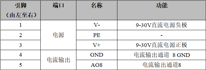 GCAN-4068模塊集成8路0-24mA電流輸出接口、8路0-24mA電流輸出接口GND端、1路DC8~32V電源接口、1路CAN總線接口。GCAN-4068模塊4路電流輸出接口、4路0-24mA電流輸出接口GND端接口、CAN-bus接口如圖所示,接口定義如表所示。