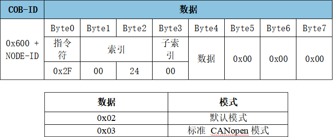 報(bào)文:ID:0x601數(shù)據(jù):2F 00 24 00 03 00 00 00,設(shè)置模塊為標(biāo)準(zhǔn)CANopen模式。